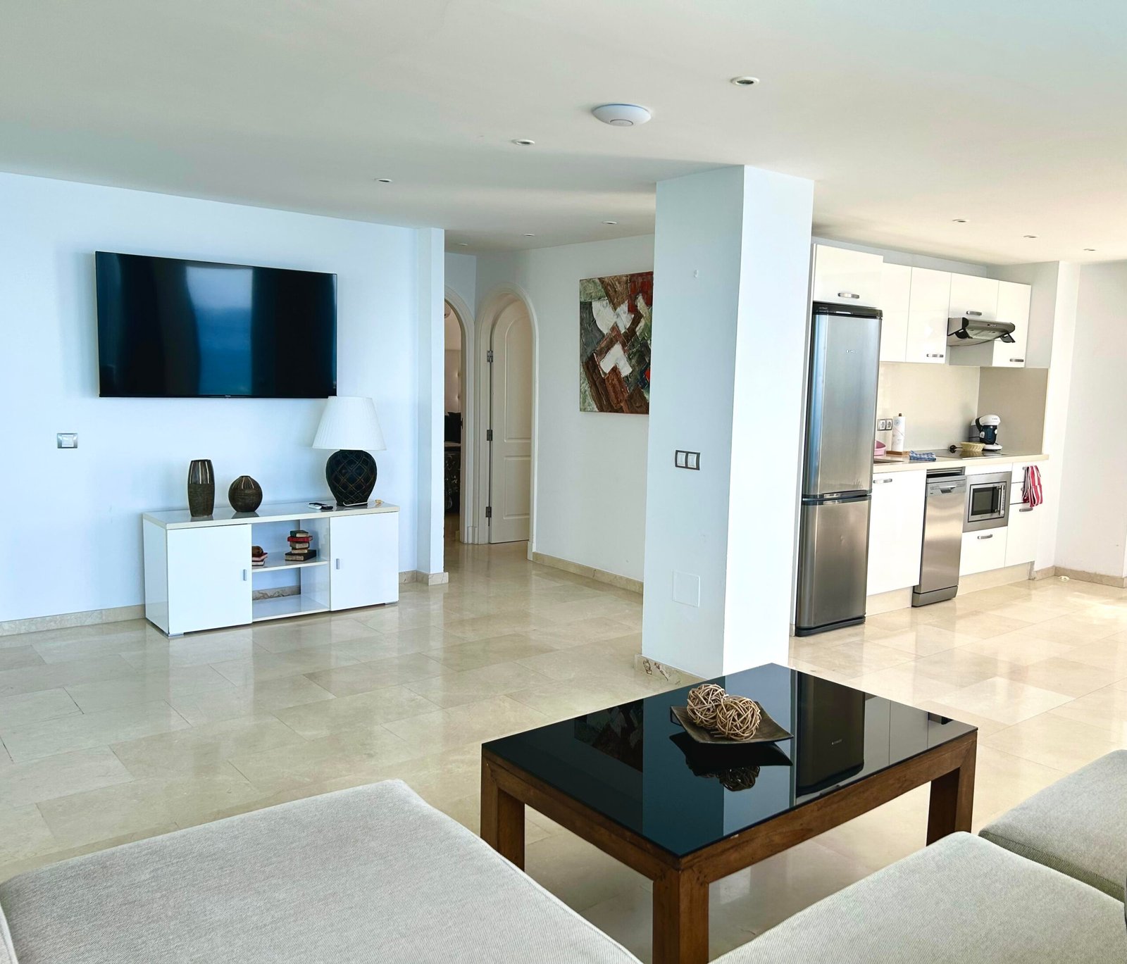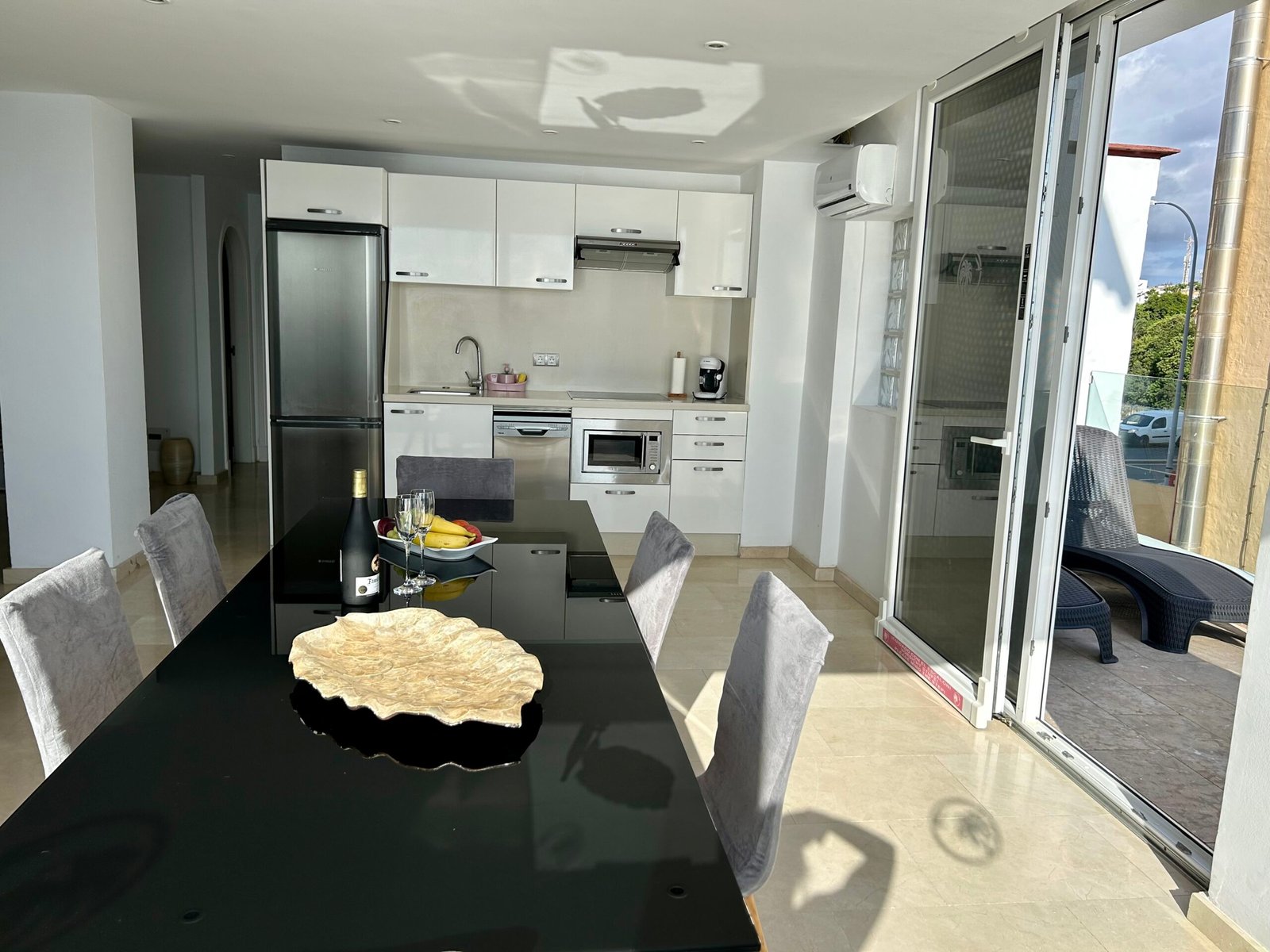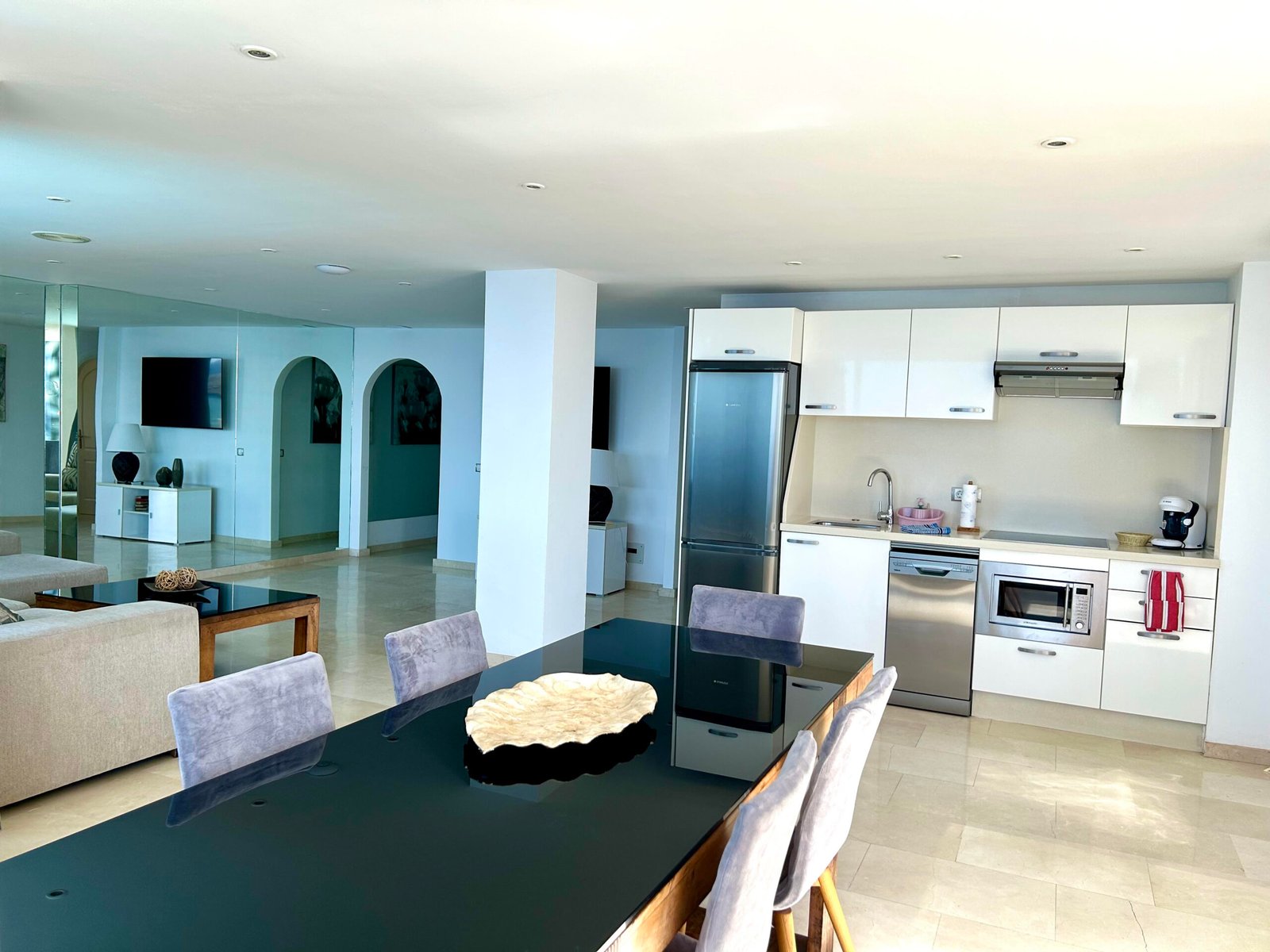 The 2-bedroom suite is fully equipped, with integrated kitchen, with ceramic hob, coffee machine, kettle, microwave, toaster, fridge and freezer, air conditioning, free Wi-Fi, dishwasher, flat-screen Smart TV with streaming services (Netflix), bathroom with shower, Toilet, hair-dryer, bed linen, towels, safe and shared washing machine and dryer.